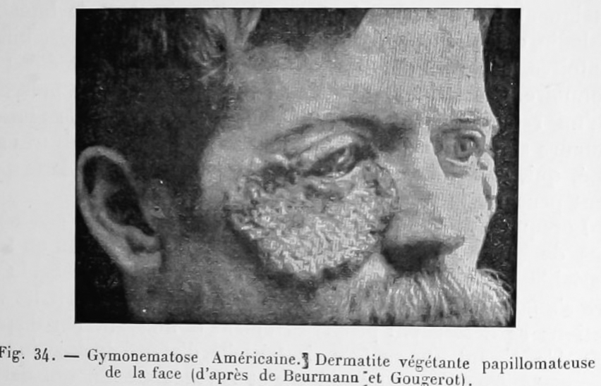 Gymonematose américaine. Dermatite végétante papillomateuse de la face. (d’après Beurmann et Gougerot). Traité de Pathologie exotique clinique et thérapeutique sous la direction de Ch. Grall et A. Clarac. VII. Maladies parasitaires et Peste. Salanoue-Ipin, Bouffard, Bussière,, Marchoux, Gaide, Martin, Leger.. Paris 1913. 660 pages