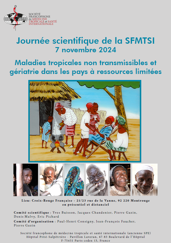 La Journée scientifique d’automne 2024 de la SFMTSI s’est tenue le 7 novembre 2024 à l’auditorium de la Croix-Rouge française (92049 Montrouge). Le thème était Maladies tropicales non transmissibles et gériatrie dans les pays à ressources limitées . Pourquoi ce thème ? Il s’agit de prendre conscience d’une part de l’importance de la transition épidémiologique dans les pays tropicaux. Les pathologies infectieuses sont toujours présentes, mais, à leur côté, les maladies non transmissibles prennent une part grandissante dans les problématiques de santé, en particulier chez les adultes de plus de 40 ans. D’autre part, l’évolution démographique voit se dessiner à terme une stagnation de la population mondiale ainsi qu’un relatif vieillissement de la population en Afrique au sud du Sahara, malgré le maintien d’une forte natalité dans cette partie du monde. Il s’y ajoute une évolution dans les rapports intergénérationnels. Dans les villes africaines, la personne âgée n’est plus l’exception respectée et choyée pour son expérience. Elle peut être isolée, avec des difficultés matérielles, sans soutien fort par l’environnement familial.
